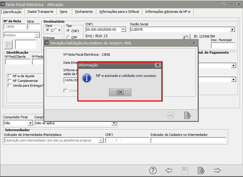 Se todas as informações estiverem corretamente cadastradas a NF-e será assinada e validada com sucesso.