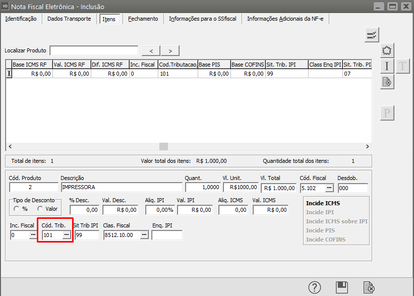 Acesse a aba itens e verifique o código informado no Campo Código de Tributação.
