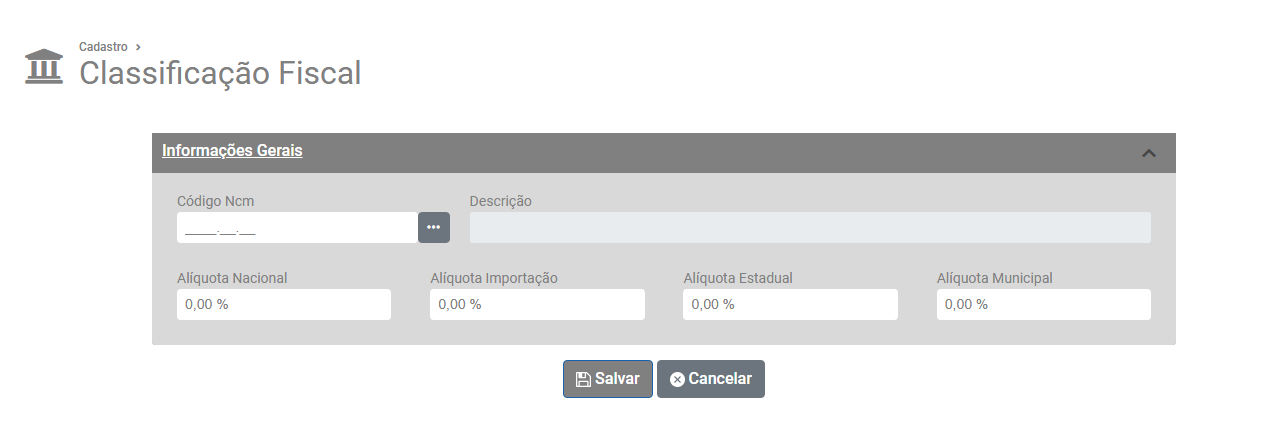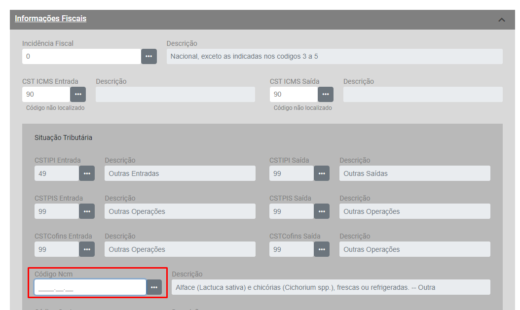 Acesse a aba Informações Fiscais e informe o NCM correto para o produto