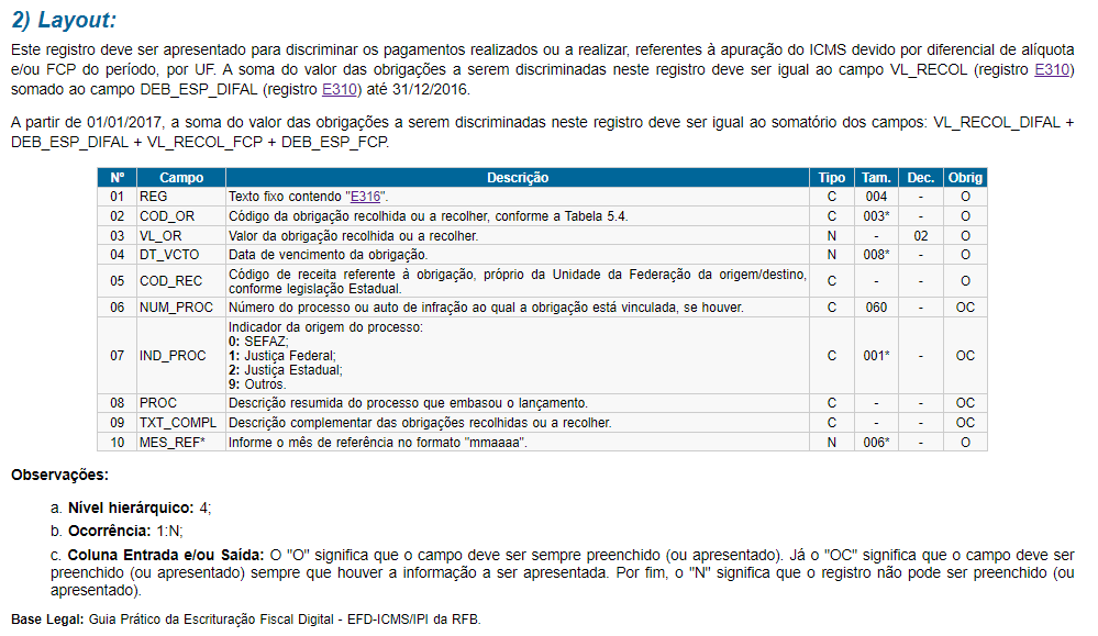 Bloco E316 - Campo obrigatório. (Campo 2 - COD_OR)