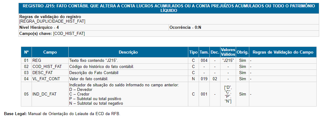 Neste registro deverão ser informados os fatos contábeis que alteram a conta “Lucros Acumulados” ou a conta “Prejuízos Acumulados” ou quaisquer outras contas do Patrimônio Líquido. A ordem de apresentação dos registros J215 representará a ordem de exibição dos fatos contábeis da Demonstração das Mutações do Patrimônio Líquido (DMPL). Portanto, o primeiro registro J215 deve conter o saldo inicial do código de aglutinação do registro J210.