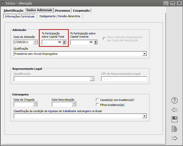 Pesquise pelo sócio e clique na seta Avança, em seguida acesse a aba Dados Adicionais, sub aba Informações Contratuais, corrija a informação cadastrada no campo % Participação sobre Capital Social.