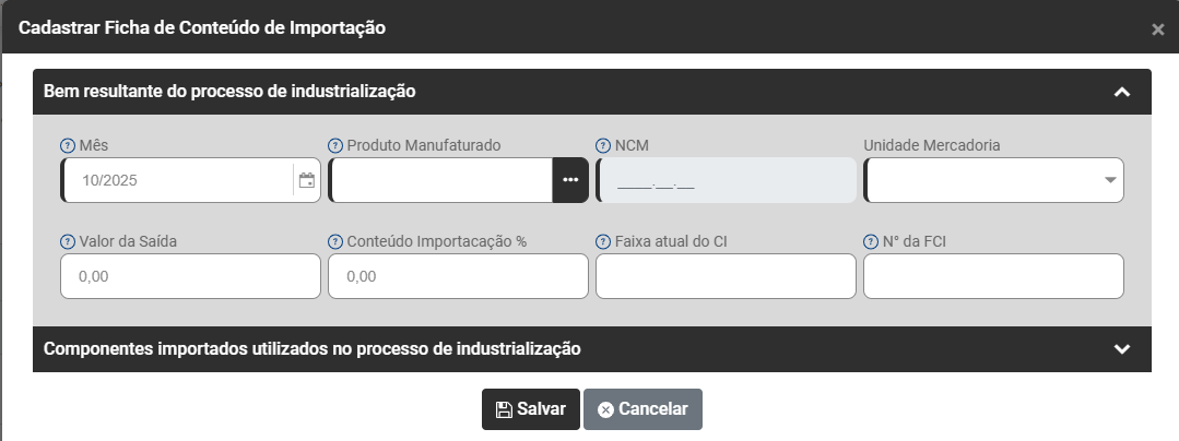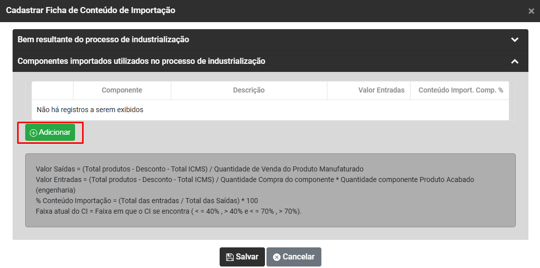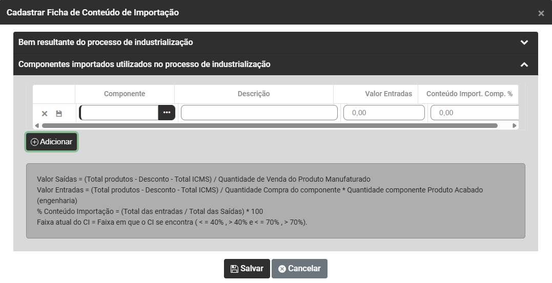 Ao acionar o botão Adicionar será apresentada a tela para Cadastrar a Ficha de Conteúdo de Importação contendo