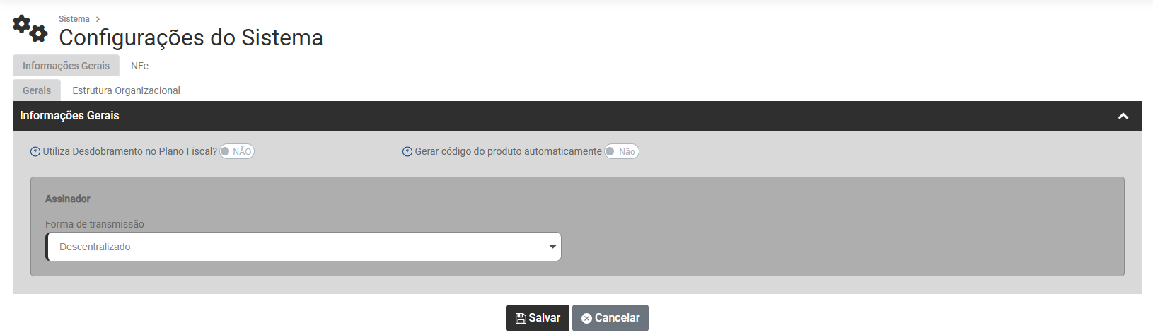 As Configurações do Sistema estão divididas em duas abas (Informações Gerais/Estrutura OrganizacionalGerais e o Módulo FolhaNFe) e na aba Informações Gerais/Gerais você terá Gerais e Estrutura OrganizacionalOrganizacional. Em Geral e Estrutura Organizaciona você irá definir Configurações que serão utilizadas em todos os Módulos do Sistema