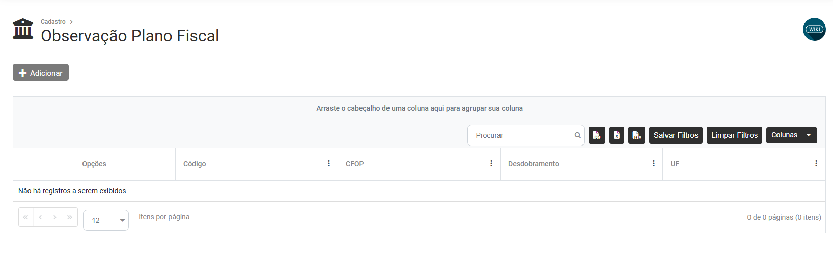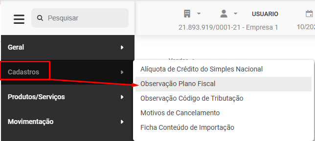 Cadastro das Observações dos CFOP (Plano Fiscal)