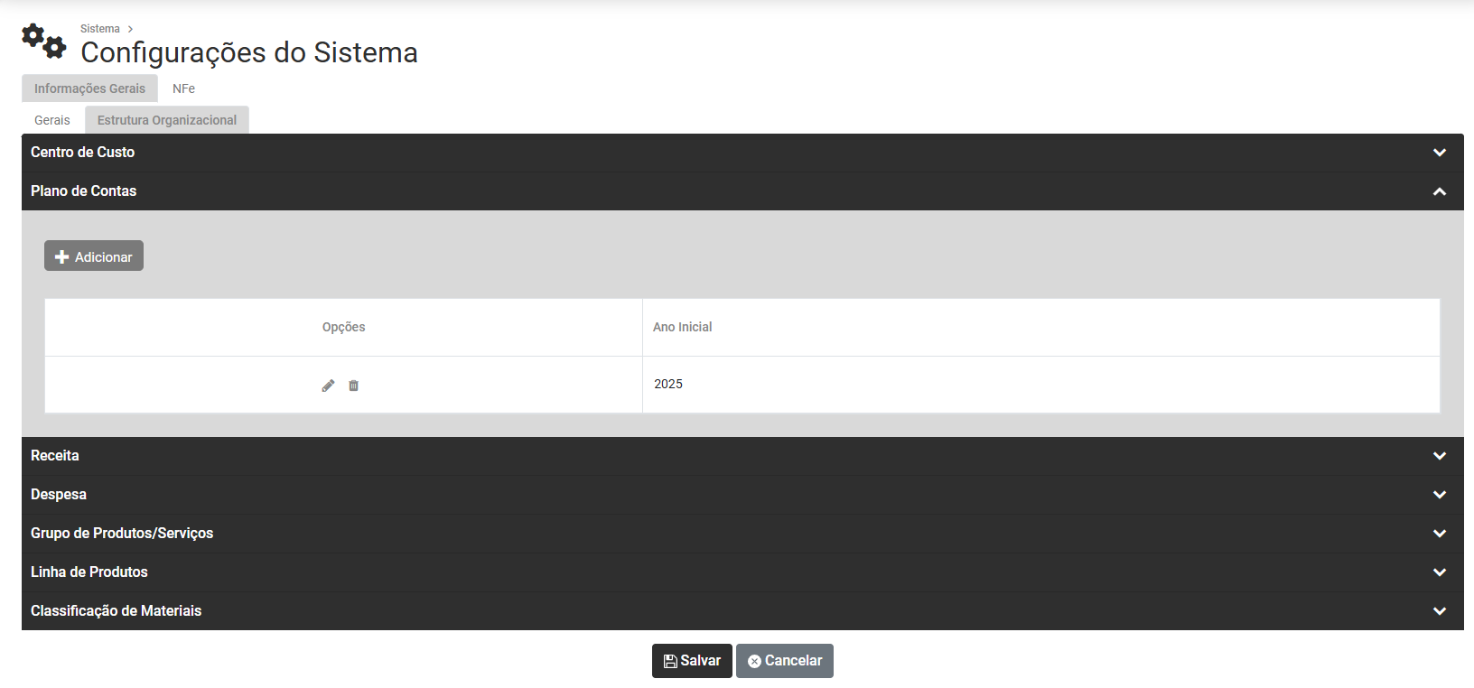Para cadastrar o Plano de Contas acesse o menu Estrutura Organizacional>Plano de Contas