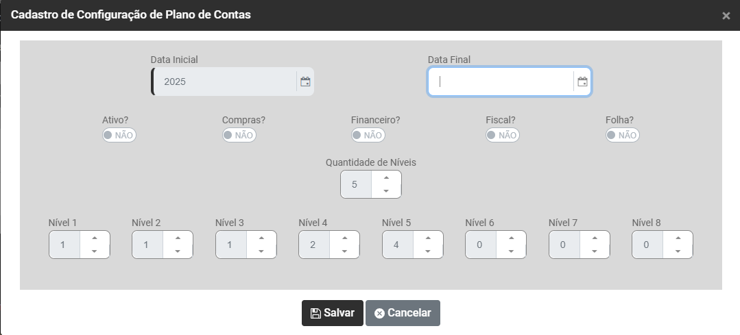 • Data de Cadastro - Não será possível a utilização desta Conta Contábil antes da data definida neste campo