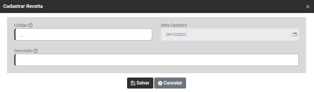 Ao clicar no botão Adicionar será aberta a tela para cadastro das Recitas, informe: