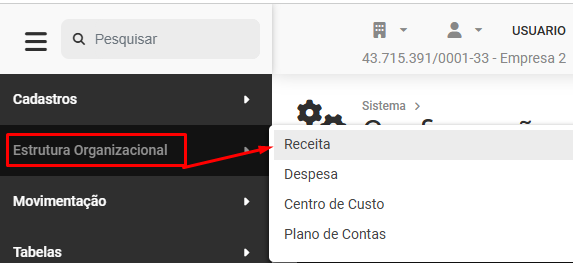 Após a definição da estrutura das Receitas acesse o menu Estrutura Organizacional>Receita